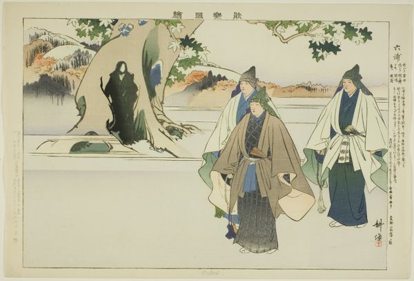 Curator: This is "Kou, from the series 'Pictures of No Performances (Nogaku Zue)'," a woodblock print created in 1898 by Tsukioka Kōgyo. Editor: The composition immediately strikes me as theatrical. The costuming, the postures—there's a drama here that pulls you in. Curator: Exactly! Kōgyo was documenting Noh theatre, which had a resurgence in popularity during the Meiji period. His prints are invaluable records of this art form’s evolving cultural significance. Editor: The figure in the elaborate wig and patterned robe--it feels loaded with symbolic meaning. What can you tell me about the iconography? Curator: Noh theatre, born from ritualistic dances, held enormous social weight in Japan. Actors often wore masks representing specific archetypes. In “Kou,” we're likely witnessing a scene from a play steeped in Shinto or Buddhist philosophy. Editor: Fascinating. I’m drawn to the contrast between the masked figure, the sword that has botanical adornments and the understated observers. How did the Meiji Restoration influence this representation? Was this renewed interest a way to preserve a certain national identity? Curator: Absolutely. Following the Meiji Restoration, there was a conscious effort to redefine Japanese identity amidst rapid Westernization. Reviving and promoting Noh was, in many ways, an act of cultural preservation and nationalistic pride. Think of the gender and class dynamics involved. How was art both reflecting and shaping social strata at the time? Editor: Looking closely, one begins to realize it is not just a representation but also a historical document laden with nuances concerning power, ritual, and identity, carefully composed. Curator: Indeed. And it's through that intersection of history and visual storytelling that we can gain deeper insight into the artwork's lasting relevance and Kōgyo's intention. Editor: Well, my initial impression has definitely deepened. Now I appreciate the piece's many layered facets. It feels so much more intricate than I had originally perceived.