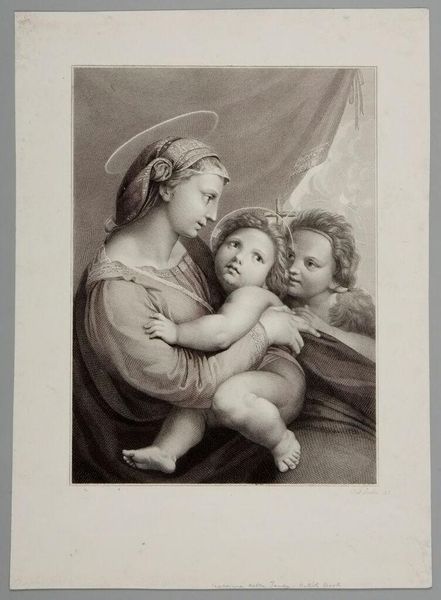 Curator: We are looking at Paolo Toschi's "Madonna della tenda," housed in the Harvard Art Museums. Editor: It's quite somber, isn't it? The lack of color emphasizes the formal arrangement of the figures. The halos add a stark circularity against the darkness. Curator: Indeed. This print exists within a long tradition of disseminating religious imagery, making such iconic works accessible to a wider audience. Think of the role of prints in shaping popular devotion. Editor: The cross-hatching is subtle but so effective in creating depth and volume. The artist's control over line weight is commendable. Curator: Absolutely. We see the artist's attention to tonal variation and how they work to emulate the paintings that came before it. Editor: The expressions, rendered in monochrome, speak volumes about emotional restraint. It's a poignant piece, even without color. Curator: Precisely. It is fascinating to consider this work in the context of the history of religious iconography. Editor: And equally fascinating to consider it from the standpoint of pure visual structure.