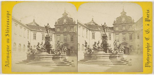 Editor: So, this is a stereo photograph, "Entrance to Prague Castle and the Archbishop's Palace" by Charles Gaudin, dated 1868. The symmetry and stark light give it a very formal feel. What stands out to you about this piece? Curator: As a stereo photograph produced in Paris for commercial purposes, this work invites examination through a materialist lens. Think about the resources, the labour involved in not only capturing the image, but also printing and distributing it for mass consumption. Editor: Mass consumption, like a souvenir? Curator: Exactly. These stereo cards were highly popular. We should ask, what purpose did this object serve in its time? It speaks to the burgeoning tourism industry and the commodification of culture and place. Look at the contrast between the grand, ornate architecture of power—the castle, the palace—and the industrialized photographic process used to reproduce its image. Editor: So, the technology itself, photography, becomes a kind of "factory" for churning out these images? Curator: Precisely. Consider also the photographer’s role in the industrial chain: was this piece commissioned? Does it reproduce other images for sale to tourists? By focusing on production, reproduction, and circulation, we start to peel away layers of meaning related to class, power, and the evolving cultural landscape. Editor: That’s fascinating. It really makes you consider the impact of technology on art and society back then. I'll definitely consider this when looking at other landscape photography. Curator: Indeed. Thinking about these details and context gives us a new lens through which to better consider what it represents.