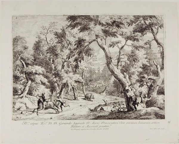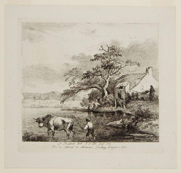 Curator: This is Samuel Howitt's "Herding Cows," an etching that captures a tranquil, pastoral scene. Editor: It's evocative! The image has a certain understated power, the dark lines rendering an almost dreamlike state. Curator: Howitt was known for his animal depictions. Consider the social context: the rise of landscape art, alongside England's agricultural revolution. Editor: And the symbolism! The cows, representing fertility and abundance, being guided through a somewhat wild landscape speaks to humanity's relationship with nature. Curator: Precisely, and the print medium made such imagery accessible to a wider audience, shaping perceptions of rural life. Editor: The line work is fascinating as well; see how it almost dances on the page, giving the scene a vital energy. Curator: It is a compelling snapshot of a time undergoing rapid change. Editor: Yes, it reminds us of the enduring resonance of simple, agrarian imagery.