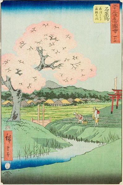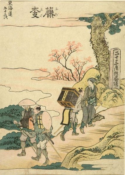 Curator: This is Katsushika Hokusai's woodblock print, "Restaurant by the Tenryu River/ Hamamatsu," part of his series on the Tokaido Road. Editor: The first thing I notice is how the bending, almost burdened trees dwarf the human activity. It’s a curious compression of scale. Curator: The Tokaido Road held immense cultural importance, shaping collective journeys and memories. The restaurant embodies a place of transition and rest, recurring motifs in travel narratives. Editor: Yes, and the color palette—pale sky, strong reds, and earth tones—emphasizes the materiality of the print itself, highlighting the artist's careful selection and application. Curator: It's interesting to consider how Hokusai uses the motif of the traveler, a figure of movement and change, to reflect upon the shifting cultural landscape of Japan. Editor: Ultimately, the composition guides our eye, weaving us through the landscape and inviting contemplation of the traveler’s experience.