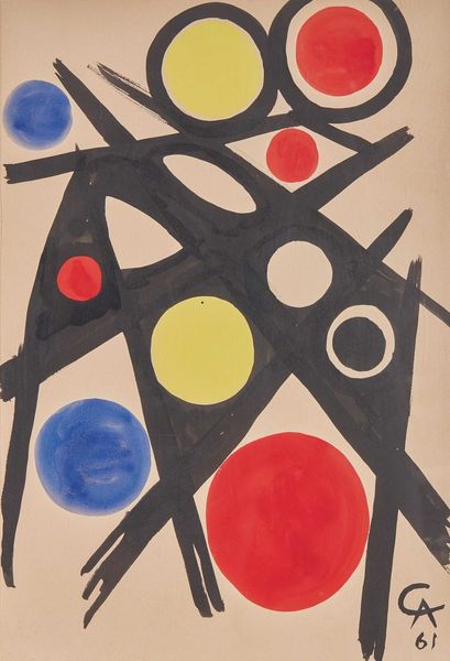 Curator: Gazing at Alexander Calder's "Black Lines" from 1975, I'm instantly hit with a sense of… well, sheer joy! It’s so playful, so unapologetically simple. What do you make of it? Editor: From a formal standpoint, the piece relies on a fascinating tension between flatness and implied depth. The composition unfolds as a field of primary colors defined by those stark, almost cartoonish, black lines, rendered in acrylic paint. Curator: Cartoonish, yes, but delightfully so! Calder, known for his mobiles, translates that kinetic energy to a static canvas. Those bold circles floating against a stark background make me think of planets aligning, or maybe just really delicious lollipops. Editor: Indeed. The geometric shapes are arranged in a way that suggests movement, a dynamism typical of Calder's larger body of work. And consider the semiotics of color: the vibrant reds and blues command attention, offset by a more passive white, all organized to stimulate visual rhythm across the painting. Curator: Absolutely. And knowing Calder, I suspect there's also a tongue-in-cheek nod to the art world's seriousness. Like, "Hey, let's not take ourselves too seriously; art can be fun, can't it?" He's almost winking at us with those jaunty angles. Editor: One could argue the simplicity borders on the iconic, an act of visual reduction where Calder strips down to pure, elemental forms, asserting a dialogue with modernism, where abstract simplicity conveyed profound visual complexity. Curator: I get that. It's deceptive in its simplicity. Looking at it again, I'm reminded that Calder was working at a time when many artists were diving deep into the complex, even obscure. And here he is, almost shouting, “Let's bring back the fun!" A real shot in the arm, really. Editor: Ultimately, the painting encapsulates a certain artistic rebellion: an intentional rejection of superfluous ornamentation. I concede that what some might see as superficial playfulness is indeed a sophisticated formal game. Curator: Precisely! A visual playground, constructed with utmost intention. Editor: It is undeniable. Now, perhaps we should allow our listeners to determine the full breadth of the artwork's genius for themselves? Curator: Agreed, lets unleash our listeners.