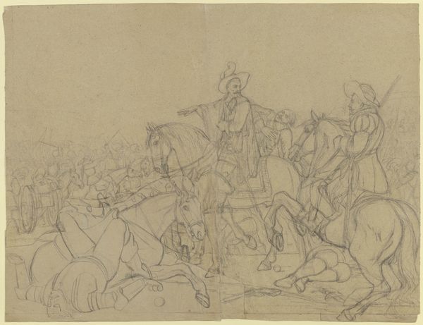 Curator: This drawing, created by George Hendrik Breitner between 1872 and 1879, depicts "Strijdende soldaten, deels te paard," which translates to "Fighting Soldiers, partly on horseback." It's rendered in pencil on paper and currently resides in the Rijksmuseum collection. Editor: It’s stark, isn’t it? So much negative space makes the chaotic action feel even more violent. The roughness of the sketch gives it immediacy. You can almost hear the clatter and screams. Curator: The sketch is part of the Romantic tradition in Dutch art. We must consider the era's valorization of heroic masculinity and martial prowess. Breitner likely saw conflict as a formative crucible for identity. How do we reckon with that ideal today, in our analyses of class and power? Editor: Looking at the dense cluster of figures versus the open space surrounding them, it makes me consider Breitner’s technique. It is like he laid down just enough graphite to give form and motion to what would have been a study of human interactions. I am struck by how such a study, created via drawing, has such power over its viewer to imply all types of production involved in conflicts. Curator: Indeed. This historical narrative comes at a cost, even as the piece might elicit a range of readings that account for trauma, exploitation, and resistance within the frame of war. Editor: From the vantage point of the 21st century, Breitner’s exploration invites conversations about power, conflict, and perhaps unintended legacies of the romantic movement that often championed ideals that, in practice, caused incredible damage. It becomes an illustration to see this sort of study, and to witness its impact and potential. Curator: Understanding how deeply implicated these traditions are in our current socio-political reality invites important self-reflection as we contextualize their representation. Editor: Yes, seeing those implications inherent within the use of the pencil on this paper offers quite a bit to consider and learn about how it plays its own important role.