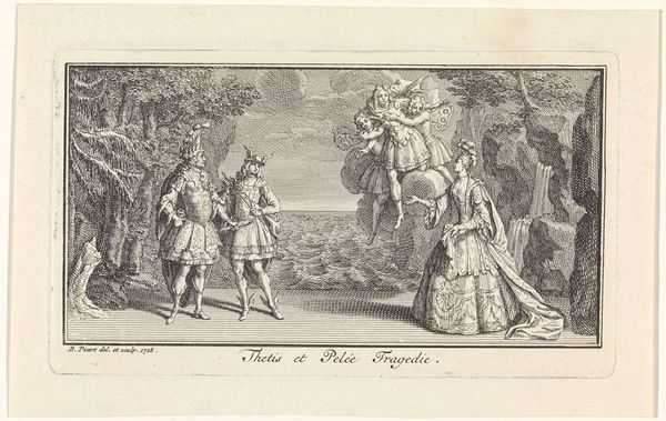 Bernard Picart created this drawing titled 'Scene from the Tragedy of Thetis and Peleus' around 1729. Observe the nymph Thetis and Peleus, set against a theatrical backdrop with winged figures overhead. Thetis, a sea nymph, is a powerful figure in Greek mythology, often associated with transformation and the mysteries of the sea. Here, she is presented in a moment of dramatic tension, reflecting the struggles and complexities of her divine nature. Think of Botticelli's Venus, also emerging from the sea, yet Thetis carries a weight of destiny. The presence of winged figures above recalls similar motifs in Renaissance art, like putti, figures that symbolize higher spiritual influences. These symbols resonate with our collective unconscious, triggering emotional responses tied to our deepest fears and hopes. This scene becomes a stage for exploring the timeless themes of love, destiny, and the human condition.