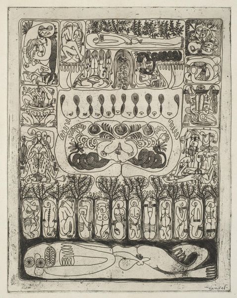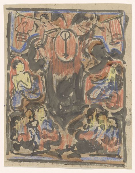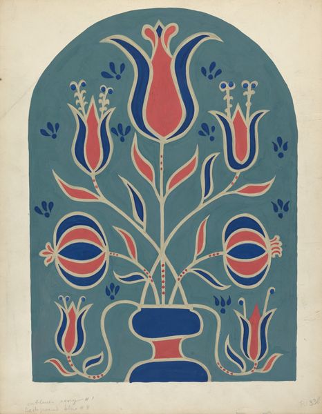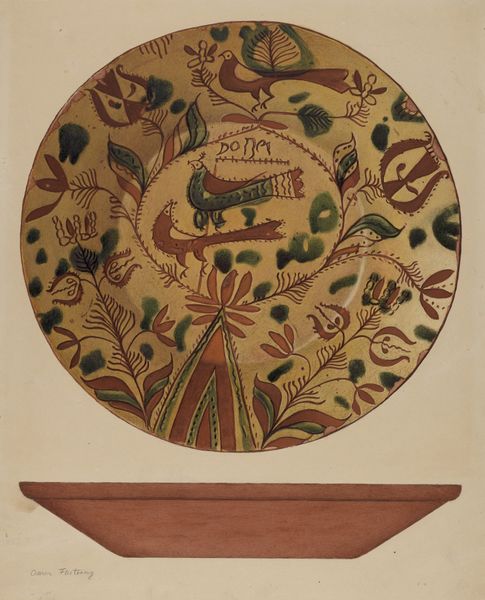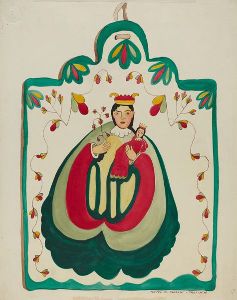 Editor: We’re looking at “Plate 32: Our Lady of Guadalupe,” part of the portfolio “Spanish Colonial Designs of New Mexico,” created sometime between 1934 and 1942. It’s a mixed-media piece, a real kaleidoscope of drawing, painting, and acrylic paint techniques. There’s something so captivating about the overall composition, particularly how the iconic imagery is rendered with folk art sensibilities. What do you make of it? Curator: Oh, this piece hums with such reverence and playfulness, doesn’t it? It feels almost like stepping into someone's vibrant memory of a sacred story. See how the central figure is framed? Almost like she's blooming from the earth itself, those organic shapes echoing both the mandorla and the landscape. It reminds me of retablos, those devotional paintings on tin, yet it breathes with a modern, almost naive energy. Does it evoke anything personal for you? Editor: It does feel very personal, especially with the bold colors and almost childlike figures surrounding the central image of Our Lady. It also reminds me of the indigenous art that was starting to become better recognized during that time. Curator: Exactly! Think about the historical backdrop – artists were rediscovering and reinterpreting their roots, creating a visual language that celebrated both faith and cultural identity. The anonymity of the artist only deepens the mystery. What’s left unsaid sometimes shouts the loudest. It's as if this wasn't meant to be a "masterpiece" in the traditional sense, but a heartfelt offering. Editor: I see that now. The simplicity adds to its authenticity. It makes me appreciate the power of folk art in conveying deep cultural and religious meaning. Curator: Me too! It's a reminder that art doesn't always need to be technically perfect to be profoundly moving.