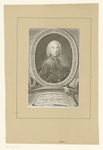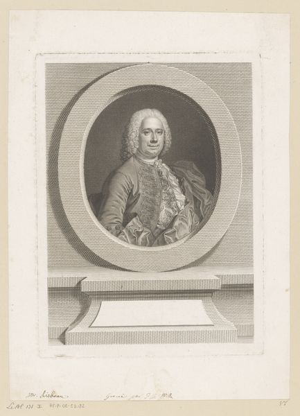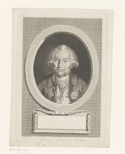 Pieter Willem van Megen rendered this print of Arnold Hoogvliet with ink on paper sometime in the late 18th century. Hoogvliet is framed in an oval, a shape that, from antiquity through the Renaissance, frequently signified the containment of virtue and wisdom. The oval, itself, has an interesting trajectory through art history. In ancient Roman portraiture, it was a common framing device found on sculpted busts, symbolizing the importance of the individual immortalized within. Later, during the Renaissance, the oval frame was revived, notably in painted portraits, signifying a rebirth of classical ideals. Consider its presence in religious art as the 'mandorla,' an almond-shaped halo enveloping Christ or the Virgin Mary, representing spiritual transcendence. The oval’s evolution tells us how symbols can cyclically resurface, each time imbued with new layers of cultural significance, yet still echoing traces of the past.