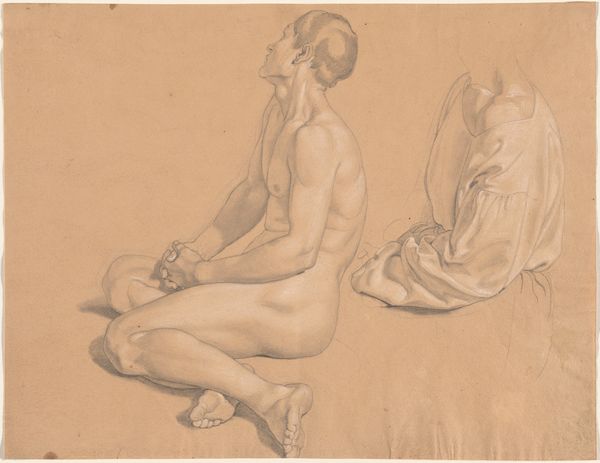 Curator: Here we have Pierre-Auguste Renoir’s "Two Nude Women, Study for the Great Bathers," housed here at the Harvard Art Museums. Editor: It’s striking how the reddish-brown chalk gives the figures a warm, almost sunburned appearance. Curator: Indeed. Renoir’s later work, especially the "Bathers" series, often draws criticism for its idealization of the female form, sometimes seen as objectifying. How might we interpret this study within the broader context of late 19th-century representations of women? Editor: I’m more interested in how Renoir uses line here. It’s incredibly fluid, almost improvisational, allowing the forms to emerge gradually from the page, creating a sense of movement. Curator: That's a valid observation, but ignoring the implications of such representation risks overlooking crucial discussions about power and perception. Editor: Perhaps, but it's the artist's technique that truly captures my attention. Curator: A productive dialogue if we seek to understand Renoir's place in art history.