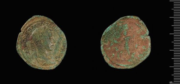 Curator: Look at this beautiful Sestertius of Philip I, now residing at the Harvard Art Museums. The Emperor himself was the artist. Editor: Time definitely leaves its mark. I see so much rich verdigris, a green patina that makes me think of underwater treasures and stories whispered through generations. Curator: Indeed. Coins like this weren't just currency; they broadcast imperial power. The imagery, likely a portrait of Philip and perhaps a symbolic depiction on the reverse, reinforced his authority. Editor: That figure on the reverse—perhaps a deity? There’s a fascinating continuity here, how leaders still use images to shape public perception, albeit through different mediums today. Curator: Precisely! Examining how this coin circulated, who held it, and what they thought when looking at it reveals a lot about the Roman Empire's socio-political landscape. Editor: It's incredible to think that this small object once had so much political and symbolic weight. Curator: It serves as a potent reminder that even the smallest artifacts can echo across millennia. Editor: A tangible link to a distant past—a story imprinted on metal.