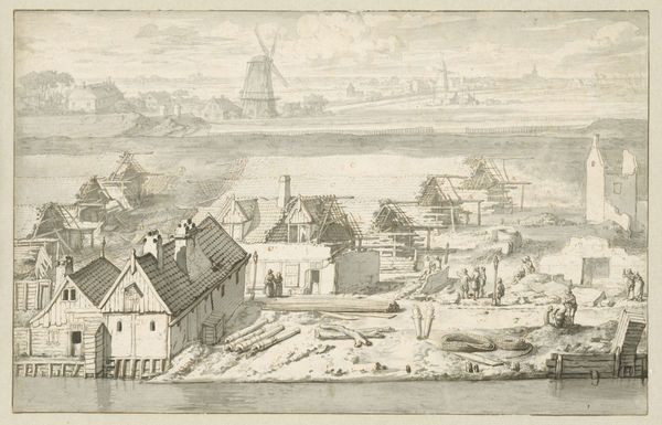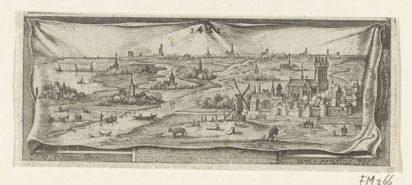Curator: Here we have a Dutch Golden Age landscape, an etching from before 1676 entitled "View of fields and houses along a country road," attributed to Johannes or Lucas van Doetechum. It’s currently part of the Rijksmuseum collection. Editor: The piece certainly has a charm to it, a simple yet intimate look at pastoral life, even if it does feel a bit flat and…unresolved? I think there’s almost a deliberate avoidance of perspective to capture everything uniformly, or maybe I’m just yearning for color. Curator: It's an etching, after all, which explains the reliance on line and shading. It also highlights a core tenant of Dutch landscape painting: meticulous details married to topographical accuracy. Note the detailed rows of crops, the thatched roofs, the working windmill in the background, all captured with remarkable precision. This focus echoes a growing interest in representing the visible world. Editor: Absolutely, it's a sort of cataloging of reality. Everything’s neatly arranged. And the presence of people going about their daily lives adds a lovely human element, but even these vignettes—the hunters and the townsfolk milling in the streets are quite...controlled. It speaks to a need to structure reality and imbue order on things. It all adds up to a serene, predictable worldview, doesn't it? Curator: Predictable, perhaps, but also reassuring, which had some purchase at the time in an unstable political clime. And look at how the sky’s rendered – lightly, barely touched – shifting attention to the land, underscoring a kind of earthly dominion. The eye roams easily over the cultivated fields, over tidy homesteads that gives me a sense of self-satisfied ownership. Editor: A very telling detail indeed. There's an undeniable harmony at work and in a way it really invites us to explore. There are hints of daily life: you can imagine the sound of the windmill, and someone riding back from market to those houses, with their characteristic sharp roofs. I get why this resonates still. Curator: Yes, despite its age, it whispers stories, making us feel part of a past that, strangely, mirrors our present. It reflects a human connection to nature, structured and maintained with care, not necessarily dramatic, but inherently enduring. Editor: Beautifully put. Makes me want to hop on a horse myself, even without the hunting hounds. Thanks for guiding my way.