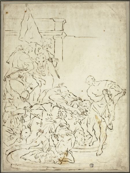 This drawing, "Nimfen en saters opgesteld rondom een siervaas" at the Rijksmuseum was created by Franz Anton Maulbertsch using pen and brown ink. The drawing presents a lively scene composed around a vase. Maulbertsch's energetic lines give the figures a sense of dynamism, and the composition, though appearing spontaneous, is carefully structured. The vase acts as a fulcrum around which the nymphs and satyrs are arranged, creating balance and visual harmony. The figures are rendered with quick, gestural strokes that prioritize movement over detail. Maulbertsch’s use of line is particularly expressive; it defines forms and conveys the emotional intensity of the scene. This approach to form destabilizes conventional representation, inviting us to consider the artwork’s underlying structure and its philosophical implications about the limits of perception.
