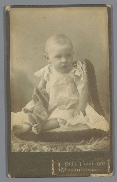 Curator: Look at this captivating photographic piece. We’re gazing at “Portret van een onbekende baby op een kussen” by Koene & Büttinghausen, created around 1908. It’s part of the Rijksmuseum’s collection, isn’t it darling? Editor: My first thought? The way that baby's little bare feet peek out from under the lace – pure, unadulterated innocence. There’s something timelessly human about capturing that fleeting stage of discovery. Curator: It does tug at the heartstrings. This photograph employs the soft focus typical of pictorialism, blending impressionistic sensibilities with the staged formality of portraiture, it almost reminds me of some pre-raphaelite babies I saw recently. Editor: And think about what that cushion represents – it’s not just for comfort; it’s literally elevating the baby. In iconographic terms, placing the subject on a raised platform can signify importance or even deification. Though, in this case, it seems like a sweet, playful way of highlighting this child’s inherent value. What gets me most, it’s not overtly symbolic; it’s gentle. Curator: Absolutely, it plays beautifully on the era's romantic idealization of childhood. I do find myself pondering the unknown baby’s gaze. Is it curiosity? Surprise? Maybe a touch of skepticism, who are these adults hovering around with boxes and blinding flashes, honestly. Editor: Haha! Maybe a bit. And it begs a more existential question, doesn't it? That unidentifiable, yet familiar face... it echoes countless childhoods. That desire to capture something so profoundly new—so purely full of promise—as it enters our world. It reminds us of what connects us generationally. Curator: Nicely put. A simple yet potent exploration of beginnings, wouldn't you agree? Perhaps now less about a single, unknown infant, but the collective history of innocence in sepia tones? Editor: I’d say that sums it up rather perfectly, offering layers of cultural memory through something seemingly straightforward and familiar: a baby portrait. It feels as resonant today as it must have in 1908.