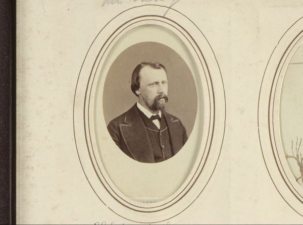Editor: We're looking at "Portret van een man met snor en baard," a gelatin-silver print from sometime between 1879 and 1900, by Hendrik Johannes Craije Azn. The sepia tones give it such a nostalgic feeling, like a glimpse into another world. What stands out to you when you look at it? Curator: Ah, yes, what a fine chap! Well, first off, I'm always struck by the direct gaze. It's a window into his soul, wouldn't you say? Given the timeframe, think of the meticulous process, each print a testament to time and skill! Also the framing -- this oval presentation, do you feel it softens what might be stark in a more rectangular boundary? Editor: That's a really good point, about the framing and the softening effect. I hadn’t considered that. It makes him look almost like a cameo, you know, the kind you'd see on jewelry. Do you think the artist was going for that effect? Curator: Perhaps! Though portraits of this time capture the very human desire to fix the fleeting. Jewelry immortalizes the loved ones we hold most dear; this portrait makes the everyday enduring. If his gaze could talk, imagine what stories it could spin, perhaps some local scandal or two? What say you, anything that strikes you in particular about his bearing? Editor: I hadn't really noticed the framing until you pointed it out, so that's a great insight. It’s also helpful to be reminded to consider how techniques that we think of as quite straightforward now would have taken so much precision. Curator: Precisely, my friend! Remember, every glance at such art opens not just the archives but the corridors of possibility and imagination. We walk through the light they created as we cast our own now.