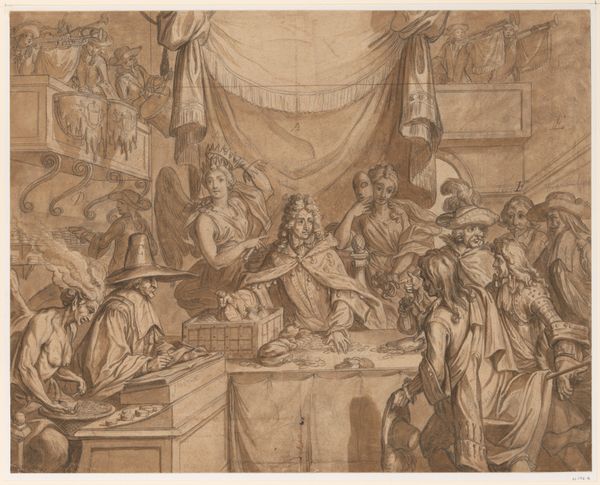 Wilhelm Marstrand rendered "Bellman'sk motiv: Koncerten på "3 Byttor", Fredmans epistel nr. 51" with pen and brown ink, creating a scene teeming with musical energy. The composition, though appearing spontaneous, is carefully structured to capture a boisterous, informal concert. Notice how Marstrand employs dense cross-hatching to define forms and create depth, particularly in the darker areas which contrast with the sketchier, lighter regions. The figures, clustered around a central singer, are rendered with an emphasis on capturing their individual expressions and gestures. The lines convey a sense of movement and immediacy which adds to the lively atmosphere of the scene. The use of line, rather than color, directs our gaze and articulates the scene's various components. Marstrand transforms what might be a chaotic scene into a coherent and engaging visual experience through his control over the medium. This drawing reflects a moment of artistic interpretation that captures the spirit of music and social gathering through formal means.