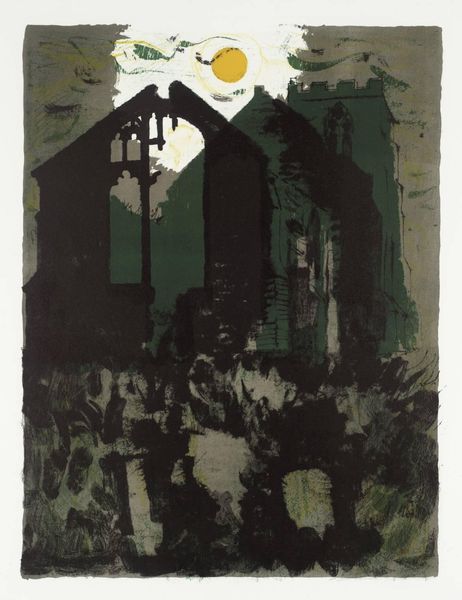 Editor: This is John Piper's "Petit Palais: Pink and Yellow" from the Tate Collection. The architectural forms are so striking, but the colours feel almost jarring together. What symbols or meanings do you see at play here? Curator: The Petit Palais, though fragmented, suggests enduring cultural institutions. Notice how Piper uses colour and form to convey memory. The fractured image could represent the way we piece together the past, influenced by subjective experience. What feelings do the pink and yellow evoke in you? Editor: Perhaps a sense of nostalgia mixed with unease, considering how disjointed the palace appears. Curator: Precisely! Piper’s work reminds us that symbols are never fixed; they evolve with cultural and emotional context, inviting constant reinterpretation. Editor: This definitely gives me a new way to appreciate how complex a seemingly simple building can be!