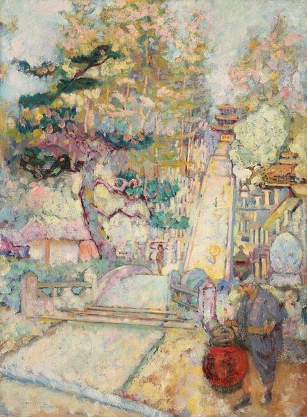 Curator: Before us hangs "Femmes et enfants dans un jardin en été," which translates to "Women and Children in a Summer Garden." It’s an oil on canvas created by Henri Lebasque around 1912. It just breathes of simple, idyllic family life. Editor: The initial feel is absolutely gorgeous. It has such a dreamy, warm feel to it. It's hazy and luscious all at once with that strong central composition built through framing. The colors are so evocative. I would also stress the intimacy it reveals, maybe by virtue of it being framed. Curator: Absolutely. Lebasque masterfully uses light and color to create this atmosphere, doesn't he? I can almost feel the warmth of the sun filtering through the leaves and smell the sweet fragrance of the garden’s flowers. He uses broad brushstrokes with the greens melting together in this dreamy summer atmosphere. I love how he focuses the light towards the center of the composition, towards the children playing. Editor: Yes, the luminescence of the garden and the composition here are masterful, achieved mostly via an impressionist-like patchwork of layered brushstrokes, especially visible in the women’s dresses or in the pink shades of the flowerbed below. These are obviously a family in a safe private haven – a garden protected, shut off from the outside. The framing certainly contributes to that effect by shutting out the garden from prying eyes, creating what seems like an incredibly comfortable microcosm. I guess you would class this painting among genre-painting. Curator: I think that the genius here really lies in the post-impressionistic feel. It brings so much raw life, movement and the simple energy of kids playing and mothers and daughters chatting, to the front. If anything this makes this garden so realistic in its intimate framing of that day. I wonder how much of it he painted plein air. Editor: It definitely bears marks of impressionist and post-impressionist styles; and there is also that slightly darker feel. What strikes me more are the pure material properties, for example the composition relies quite substantially on this dialogue of brick vs green nature, in terms of color, shape and even materiality – it offers a certain contrast to an otherwise quite homogenous artwork. It gives the garden depth. Curator: It's so simple in execution, so grounded in a simple human connection that for me the emotion conveyed within is something incredibly tangible. Almost a memory in a sense. Editor: Absolutely, that material property adds some much needed balance. For all of us, I believe this painting speaks on several levels – a masterful interplay of colors, light and the sheer bliss and private feeling to it.