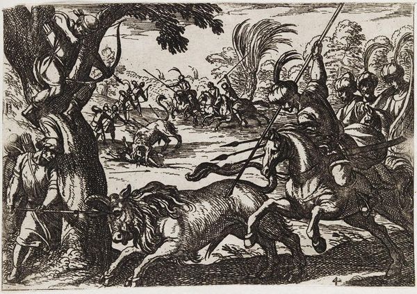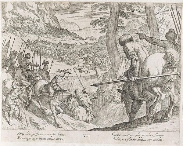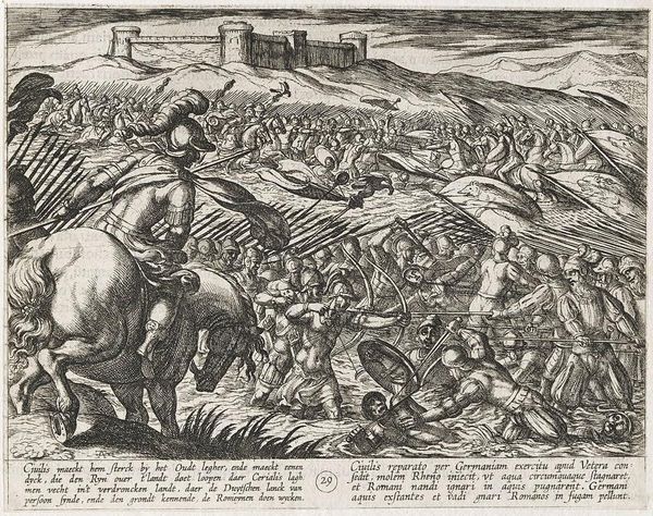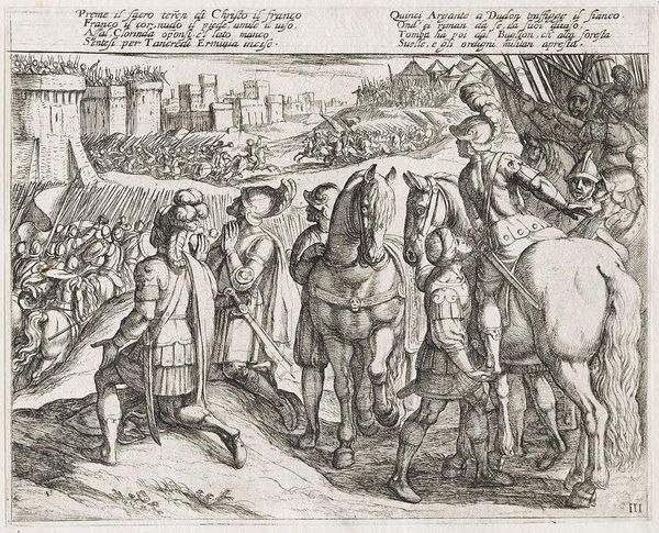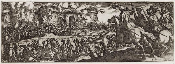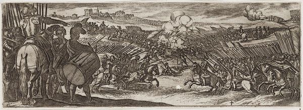 Curator: Antonio Tempesta created this etching, "An Army Marching Outside a Town." Editor: My first thought is the sheer density of figures—it's a teeming mass rendered in intricate detail. Curator: Tempesta, active in the late 16th and early 17th centuries, produced many battle scenes, reflecting Europe's almost constant state of conflict. The print likely served to glorify military power. Editor: True, but observe how the tight composition focuses on texture and line. It almost abstracts the event, turning it into a study of pattern and form, no? Curator: Perhaps, but consider that the intended audience probably viewed it as both a celebration of their own military prowess and as a warning to rival states. Editor: It is compelling to consider the different layers of meaning that arise simply from the organization of elements in the composition. Curator: Yes, context shapes our perception, reminding us that even formal qualities carry historical weight.