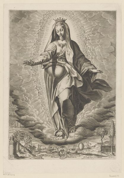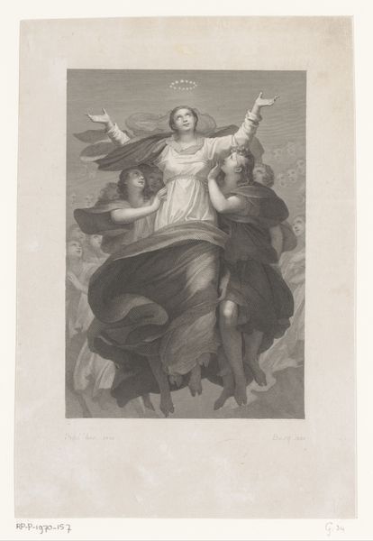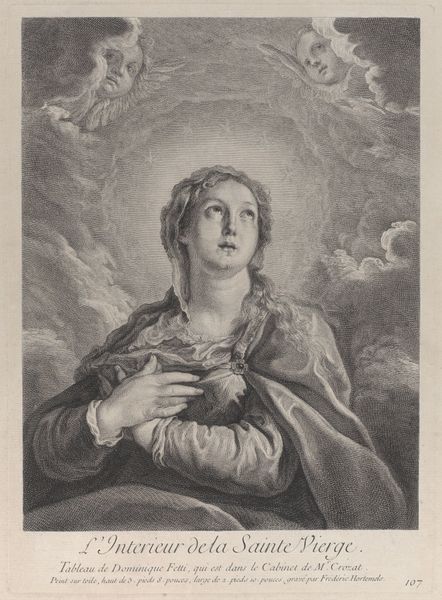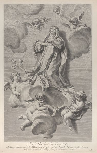 Curator: Let's discuss "Maria van de Onbevlekte Ontvangenis," an engraving by James McArdell, likely created between 1745 and 1765. It resides here at the Rijksmuseum. Editor: It's a strikingly ethereal piece. The swirling clouds, the upward gaze of the Virgin, surrounded by those chubby cherubs – a very evocative atmosphere. It immediately speaks to ideas of transcendence and spiritual yearning. Curator: Absolutely. We have the central figure, Mary, seemingly floating amidst celestial beings. It's important to understand that this image reflects the evolving doctrines around the Immaculate Conception. This work provides a glimpse into the social and religious expectations placed upon women, particularly concerning purity and virtue. The cherubs act not just as decorative elements, but reinforce a specific iconography tied to the feminine ideal. Editor: I’m drawn to the textures achieved solely through engraving. Consider the drapery - the labor invested in depicting those folds must have been substantial. The contrast between the smoothness of her skin and the almost rough texture of the clouds underscores the material effort involved in representing the divine. It hints at the consumption of religious imagery in that period, the value placed on detailed depictions that conveyed the desired messages. Curator: Precisely. The use of engraving allowed for widespread dissemination, shaping perceptions of the Virgin Mary, and solidifying particular understandings of faith. Consider also the whiteness presented here – does it present any barriers? Editor: In my eyes, it makes you think of what kind of paper and ink were available during the period in Europe. The scale too – how big could the plates get? Curator: By understanding the intersections of power, faith, and artistic production evident in an object like this print, we can further access meaningful narratives around women and religion in the eighteenth century. Editor: Indeed. Reflecting on this piece, it's a powerful reminder of how artistic materials and processes served religious narratives, ultimately contributing to societal beliefs and values of the time.