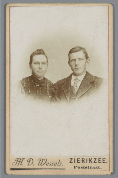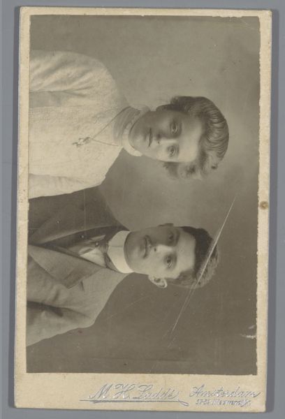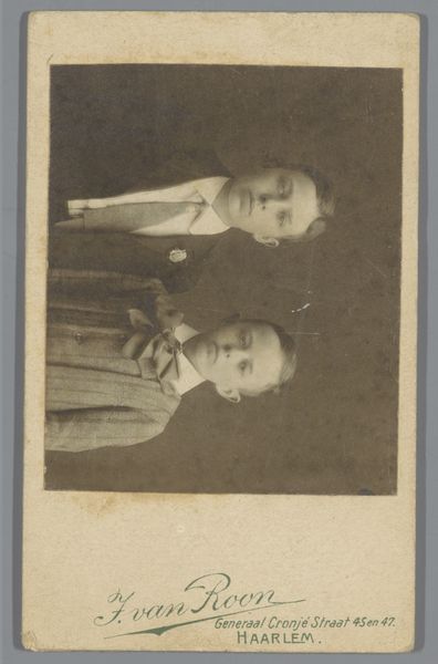 Curator: Before us is "Portret van een onbekende man en een onbekende jongen", a gelatin-silver print made sometime between 1893 and 1916 by Jacob Niestadt. Editor: The starkness is what hits me first. The way the two figures are positioned, one above the other... almost feels like they're floating, or perhaps, being pinned under some kind of pressure. Curator: It's interesting that you pick up on pressure. Group portraits, especially father-son images like this one, often served to solidify societal norms of patriarchy. This visual structure, consciously or unconsciously, replicates those power dynamics. Editor: Yes, visually there is a hierarchy present between the two. Though it is subtle it does not seem very traditional; there is something strange in the positioning, the angle is almost as if the photographer or the people fell on the side. Curator: What speaks to that “strange” element for you? Editor: Well, looking at them now, there is no familiar pose between father and son: it might be a representation of the distance that sometimes appears between families or, a need to find an unposed photo, more realistic to the every-day. The photograph lacks the warmth I'd expect to see represented here. Curator: I appreciate you bringing that point up. We're seeing a specific class position reflected here. Restrained emotion can be argued to reflect the male emotional codes that became entrenched in the middle class in that period. Thinkers even spoke about a type of 'affective capital' that men carried in such class positions. Editor: So the apparent emotional distance is perhaps performative to a degree, designed to uphold these codes? That makes me reconsider my initial sense of pressure - perhaps it's the pressure of societal expectation manifesting in the portrait. Still, even with context, the gaze of that boy feels heavy. What emotional weight do you see carried in the symbol of "the son" itself? Curator: Historically, it has carried the hopes and the sins, and often becomes a proxy for future prosperity. Thinking about our current cultural moment and the weight on young shoulders navigating intersecting crises of climate and political precarity, it feels particularly resonant now. Thank you for sharing your perspective. Editor: It’s true that images take new shape in the present, even when tethered to the past. These echoes that reverberate through time are worth thinking through deeply.