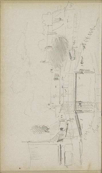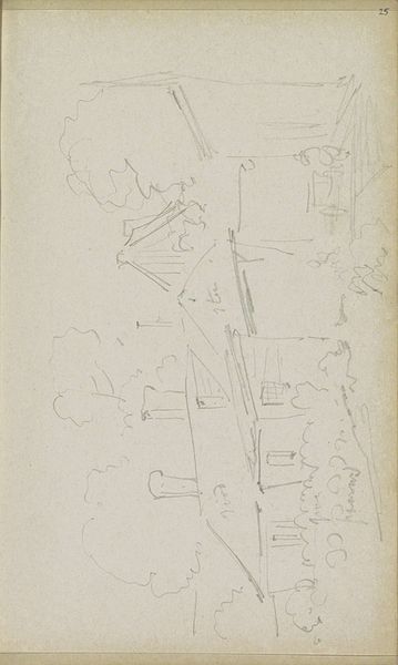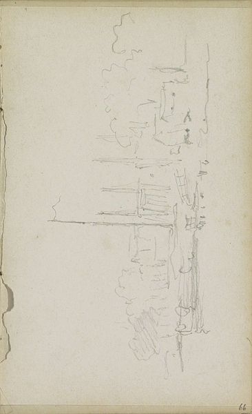 Curator: At first glance, this preliminary sketch by Adrianus Eversen titled "Gezicht op een straat met een kerk" appears strikingly minimal and evokes a certain emptiness. The light pencil strokes barely capture a cityscape. Editor: Yes, there’s a ghostly quality to it. I find the sketch rather haunting. Eversen captures something essential here about the quiet desolation of urban spaces. Is there any historical context that might shed light on this feeling? Curator: Eversen created this sketch sometime between 1828 and 1897. Given this period, the societal context in Europe saw industrialization reshaping cities. Consider that many rural populations were migrating to urban centers, lured by industry; but, too, experiencing overcrowdedness and impoverished living conditions, leaving previously populated towns nearly abandoned. Editor: You’re drawing an interesting connection to larger sociological shifts. Structurally, though, the drawing itself is fascinating in its starkness. Notice how Eversen reduces the architecture and environment to a skeletal outline, with particular focus on how lines articulate a certain structural bareness. What are we to make of his emphasis on line itself? Curator: Line work itself might highlight his realism and perhaps suggest a broader discourse on how artists used minimalism to depict a more sobering vision of reality and comment on contemporary societal circumstances. Editor: Well, by breaking it down through this lens, this study can teach us much about society during a transformative historical juncture. The technique almost forces you to confront the fundamentals, doesn't it? Curator: Agreed. In art history, the sketch is frequently overshadowed, considered secondary to the “final” artwork. Paying due respect to the artist's preliminary investigations opens up the way for richer sociohistorical perspectives that illuminate unseen aspects of artistic endeavors and the setting surrounding it. Editor: Yes, absolutely. Ultimately, it’s not just the subject but the raw approach, the artist's own hand in the composition, which delivers an immediate impression of place.
