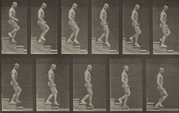 Curator: Looking at this gelatin silver print from 1887, titled "Plate Number 6. Walking", created by Eadweard Muybridge, I feel like I'm watching something both scientific and strangely poetic. What's your first take? Editor: Restrained. Very Victorian in its approach to, well, *everything*. There's an intense desire to categorize and contain. See how the grid imprisons the figure’s kinetic potential. It reminds me of someone trying to trap smoke in a jar. Curator: Yes, absolutely! And that smoke—that fleeting moment—was Muybridge's obsession. He wasn't just capturing a walk; he was dissecting it, frame by painstaking frame, and in doing so revealing to everyone for the first time, the hidden mechanics of the act of moving. Editor: Indeed. Think about the analytic framework. Each captured instant is a discrete data point—almost a form of early modernism. Yet Muybridge frames this with the aesthetic values of his time: The human form is, idealized in a certain, classically academic manner, yes? The body’s presentation as objective scientific observation seems deliberately posed for study. Curator: Right. And think about what it meant to see this then! To see how the feet actually lifted, the precise angle of the knees. Before this, artists mostly guessed. And suddenly, there was this stark reality, bending perspective, but then changing everything—altering, say, painting and sculpture irreversibly. Editor: Absolutely. You see echoes of these sequences later in Duchamp's "Nude Descending a Staircase". By isolating each moment, he exposes the artifice inherent in our perception of motion itself, like those stroboscopic effects, or film loops which in and of themselves repeat to fool you that they flow. Curator: It also says something about human potential and capability; capturing a feat by means previously inconceivable… Editor: All that ambition bundled up within those little squares. Amazing, no? I keep wondering about what the model in this frame felt walking like that... constrained to each shot, but freed when he learned that he unlocked movement and possibilities to generations of artists and scientists after him. Curator: That is wonderful: to imagine both confinement and liberation locked inside these photographic boxes—we are privileged, no, to walk by, think, and see Muybridge here today.