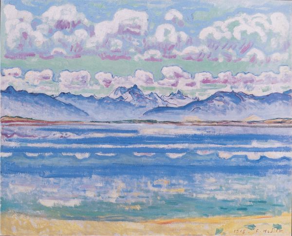 Curator: Looking at Ferdinand Hodler's "Lake Geneva, overlooking the Savoyerberge" from 1906, what grabs you first? Editor: Honestly? That hypnotic water! It's a swathe of teal and muted greens, like gazing into another world. The overall palette is so serene; it invites contemplation. Curator: Hodler’s landscapes, including this one rendered in oil paint, are steeped in symbolism. He aimed to convey more than just what the eye sees; he sought the underlying harmony and structure of nature. The repetition of forms – the mountains mirroring in the lake and the clouds – speaks to that quest for order. Editor: There’s almost a hypnotic quality in that symmetry. Yet, paradoxically, there's an intense personal expression. The mountains aren’t just mountains; they’re towering presences, almost guardians, and they feel incredibly monumental, in contrast with that thin stripe of clouds. Curator: Hodler lived much of his life overlooking Lake Geneva. It was both a constant source of inspiration and, during periods of personal tragedy, a comforting presence. The repetitive elements we discussed? Some view them as a reflection of the cyclical nature of life and death, of grief and resilience. The “parallelism,” as Hodler called it, gives form to the natural rhythm, and offers solace. Editor: That’s a profound reading! I definitely pick up on the stoicism. You know, given that it’s Expressionist and Symbolist, it isn’t tormented in the way I’d expect. The colors are calming; the composition is stable and almost classical. It’s less of a scream and more of a… sigh. Curator: A sigh… that captures it beautifully. It is far more composed than some of his more overtly emotional works. He was attempting, especially in his later works, to find universal forms, shapes, colors, arrangements, that would move the viewer irrespective of their personal background. It is his meditation of order. Editor: So, a personal vision reaching for universal resonance. I think that makes it incredibly powerful. Thank you for sharing. Curator: My pleasure. I think it gives us plenty to think about in relation to Hodler's role in early Modernism and beyond.