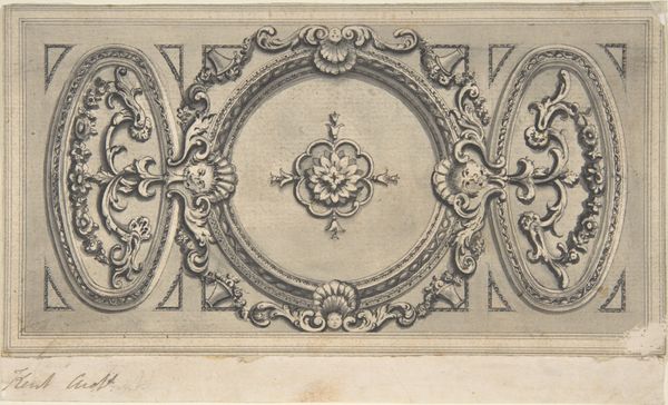 Curator: This is a drawing by Jules-Edmond-Charles Lachaise, entitled "Design for Dining Room Ceiling, Hôtel de Behague," created in 1870. It resides here with us at the Metropolitan Museum of Art. Editor: It strikes me as intensely controlled, almost claustrophobic. So much careful delineation within these rigidly defined borders! A fascinating tension exists between the organic, flowing ornamentation and the strict geometry holding it all in place. Curator: Indeed. It reflects the Neoclassical movement's penchant for order and reason, while also demonstrating decorative artistic sensibilities of that time. Think of the Beaux-Arts style influence in interior design! The "B" in the center shield most likely signified the family crest for whom the space was intended. Notice the use of classical motifs: stylized acanthus leaves and palmettes. They invoke the enduring legacy and historical connotations tied to these symbols that families sought to reflect themselves through such ornamentation. Editor: Semiotically, the geometric shapes represent an architectural system meant to give both structure and meaning; one can discern cultural and social implications even in color and textural contrasts: hard vs. soft; cool vs. warm; sharp vs. muted; dark vs. light, and so on. Do you notice any possible visual discord that stands out to you in color choice here? I have been staring and that cerulean calls my attention more now. Curator: An interesting read, in that case—because the azure tones could represent fidelity, and by inference trustworthiness—a quality a host or hostesses, for the building residents and guests. We see the repeating scrollwork is an appeal to heritage and historical roots. There's certainly much for the eye, and the mind, to unpack. Editor: Agreed. Each calculated choice, both the formal elements, and those embedded symbols, communicates complex cultural meaning. Thanks for sharing your insights on "Design for Dining Room Ceiling, Hotel de Behague" with me today. Curator: And thank you—I leave having gained another viewpoint as well.