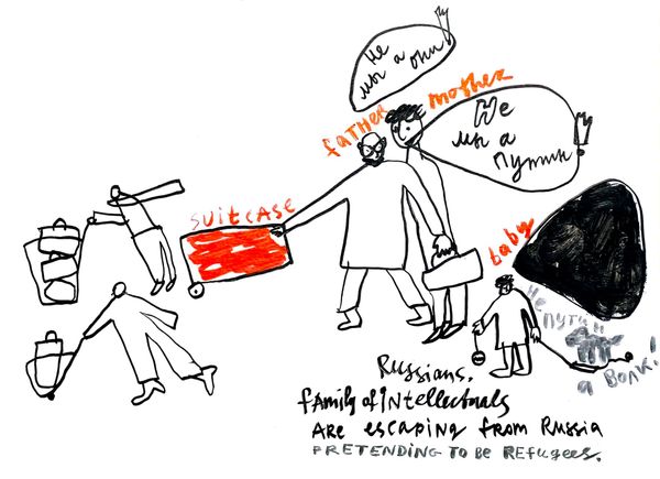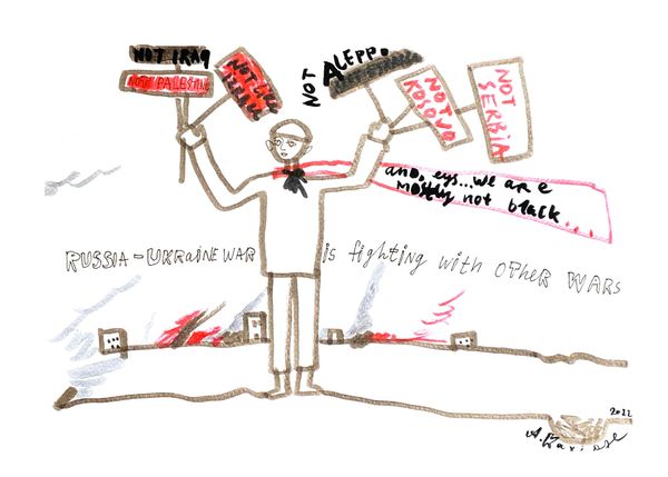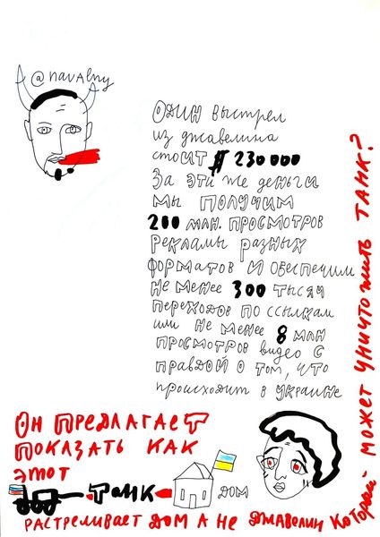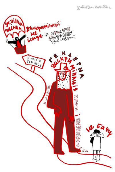 Here is a drawing made by Alevtyna Kakhidze, featuring several figures and inscriptions in Ukrainian. Note the recurring motif of blindness or obscured vision. A central figure wears a blindfold, a symbol that echoes across time from depictions of justice to allegories of ignorance. This motif appears here, perhaps, not as a representation of impartiality but as a critique of societal blindness to gender discrimination. Consider, too, the prominent heart rendered in a cool blue—a stark contrast to the warm red tones of the body. The heart, often a symbol of love and vitality, is here depicted as cold, suggesting emotional detachment or the alienation experienced in the face of discrimination. We see similar uses of this powerful symbol across centuries in art and life. This image invites us to consider how symbols and iconography are adapted and reinterpreted across different cultural contexts. It is a visual echo reflecting the past and resonating with contemporary concerns about gender equality.