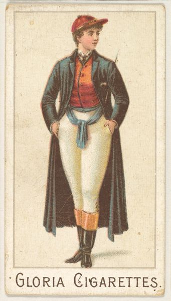 Editor: Here we have "American General Officer, 1779," created in 1888 by Kinney Brothers Tobacco Company, part of their Military Series promoting Sweet Caporal Cigarettes. It looks like it's made with colored pencils and printed, giving it a mass-produced feel despite the detail. It’s…stately, I suppose? But the general also looks a little uncomfortable in his uniform. What strikes you about this piece? Curator: Uncomfortable indeed! He’s got that "forced portrait" vibe, doesn't he? Look at those arms crossed tight across his chest. What secrets, what battles, what mundane worries is he holding close? This image, a product of its time as a cigarette card, is really a layered artifact, a portrait of an idea *of* an American hero, mass-produced to sell tobacco. How amazing is that? Does it cheapen the legacy, or democratize it? That pattern behind him, the flat, almost decorative space… does that clash with our expectation of a powerful, three-dimensional leader? I wonder… Editor: I see what you mean. It is a weird tension, between the implied importance of the general and the very commercial purpose of the card. I guess, in a way, it reminds me of the way we use images today – everywhere, all the time, sometimes with very little connection to their original meaning. Curator: Exactly! It’s almost a meme before memes existed. A quickly-consumed image meant to evoke feelings – pride, patriotism, maybe even a desire for a “sweeter” life. Does knowing it was selling cigarettes change how you perceive the general? Does it become satire somehow? Editor: I think… yes, it does. It makes him more human, almost. A symbol being used, just like everyone else. And I hadn’t thought about it as proto-meme, but that totally fits! Thanks, I'll definitely think about this differently from now on.