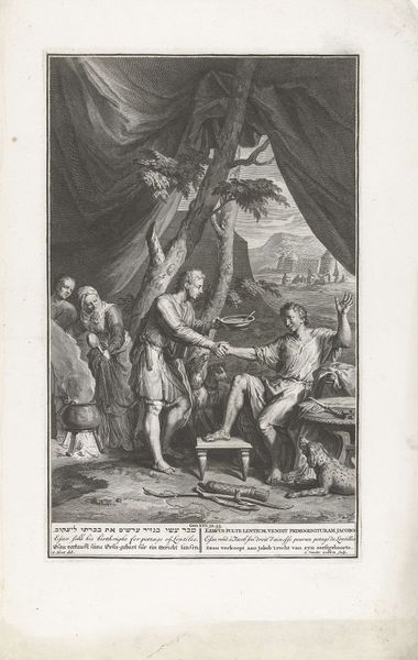 Curator: This engraving is entitled *Allegorie op het herstel van Oranje, 1787,* which translates to "Allegory on the Restoration of Orange, 1787." Editor: It has such a busy composition; my eye jumps all over the place. It seems to want to be grand, but it comes off a little frantic. What’s going on? Curator: This print commemorates the restoration of the Stadtholder, William V, to power in the Netherlands. You see various figures here that are representative of the Dutch Republic, Royalty and other allegorical references to Patriotism and other virtues from the time. It’s from the late 18th century, when such allegorical depictions were popular ways to comment on political events. Editor: The allegorical figure in the center seems the most prominent with an almost classical rendering of flowing draped clothing. I suppose it does seem right out of that neo-classical moment in painting and sculpture. And I see putti down at the bottom; are those also intended to be allegorical? Curator: They represent unity and innocence. You can see the figure being offered assistance from William V, helping her regain her footing as well. Editor: What's intriguing is the almost desperate figures cowering on the right side. It presents quite a stark contrast to the hopeful gestures occurring on the left. They’re so hunched and obscured in darkness, yet there's also great clarity given to each stroke of the engraver’s tool. The textural variations within a monochrome scheme give the image some nuance. Curator: Right. It shows the remnants of the Patriot movement which, as it declined, brought on this re-establishment of the House of Orange and the old order. The composition here, through symbolism, clearly advocates for the Stadtholder’s role as a stabilizing force. Editor: So it's a visual document, then. A piece of propaganda in a sense, immortalized in ink. And those varied textural surfaces created with line making creates not only definition but evokes a specific feeling within the allegory. Curator: Exactly, and it provides us with a lens through which to view the complex political landscape of the time and how imagery shaped public sentiment. Editor: Well, even beyond its symbolic content, there's a compelling play of dark and light and a definite mood evoked in its composition.
