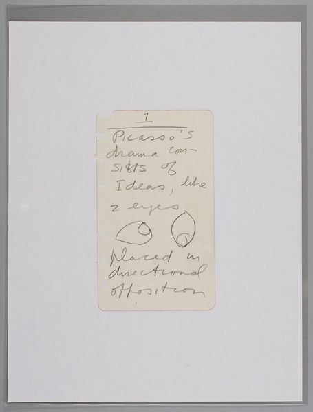 Editor: Here we have Stuart Davis' "Art Theory Text with Diagram." It's a small work, just six by three and a half inches, and appears to be a handwritten note with a simple diagram. It feels like we're looking at the artist's raw thought process. What strikes you about this piece? Curator: What's fascinating here is how Davis, known for his vibrant abstractions, dissects the fundamentals of drawing. It's a glimpse into the socio-political implications of simplifying form, as he breaks down representation to shape, size, and position. How does this compare to his larger, more public works? Editor: That's a great point! It makes me consider the power of accessible art education and how artists form their own visual language. Curator: Exactly. By examining his notes, we gain a richer understanding of the public-facing art, and the politics embedded in visual communication.