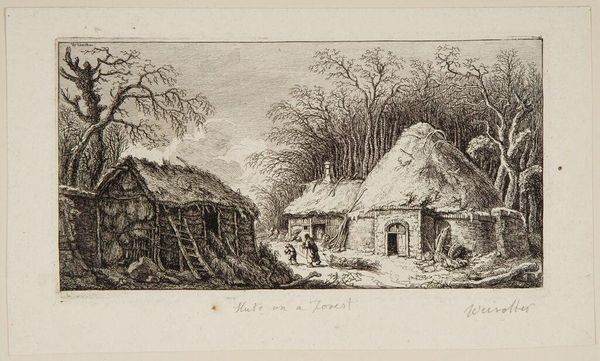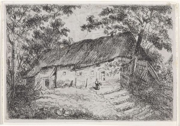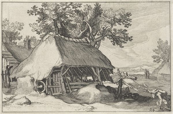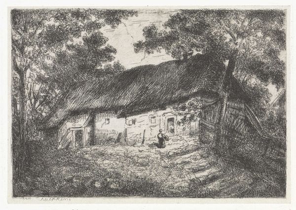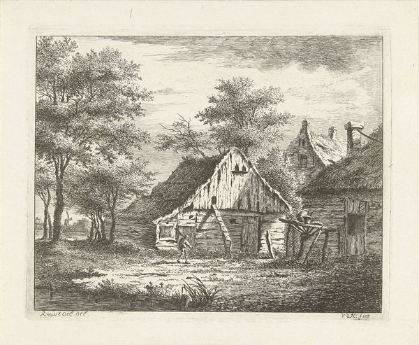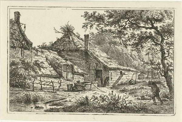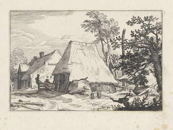 Editor: This is "Boerderij en herder met hond en geit," or "Farmhouse and Shepherd with Dog and Goat," an engraving from 1614 by Boëtius Adamsz. Bolswert, currently at the Rijksmuseum. The stark black and white imagery, combined with the thatched roof cottage and watchful animals, gives it a quiet, pastoral feel. What's your take on it? Curator: Well, it tickles my fancy to imagine the artist finding such quiet grandeur in the everyday! There's this simple, unaffected quality that gets to me. I see in it echoes of a life deeply entwined with the land, a scene captured not for its drama, but for its comfortable rhythm. I wonder, don't you think it almost breathes a certain… peace? Editor: I definitely see the peacefulness, but it also feels a bit melancholic to me. Maybe it's the lone shepherd. Curator: Ah, but is he truly alone? I think not. The dog, the goat, even the old farmhouse seem to be characters in his narrative, keeping him company, as well as giving you this melancholic vision. He is deeply a part of the land, whether he knows it or not. It speaks to a profound interconnectedness, if you will. What does that thatched roof suggest to you? Doesn't it evoke protection, resilience? It's not just a farmhouse; it's a witness. Editor: That's a great way to put it. I hadn’t thought about the house as a character, but now I totally see it. Thanks for opening my eyes to that! Curator: The pleasure is mine! Perhaps these humble lines, in their unassuming elegance, reveal a bigger truth: that beauty resides not in the grand spectacle, but in the quiet corners of our existence. What a sweet lesson it offers.