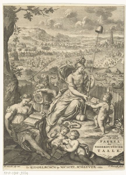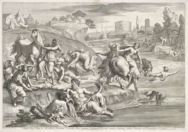 Curator: Adriaen Collaert's engraving, "Fishing in a Stream," presents a bustling river scene, rendered in meticulous detail. There's a real sense of depth, but also a rigid flatness that's quite compelling. Editor: The materiality of this print, the copperplate, and the labor involved in its creation, speak volumes about the dissemination of knowledge and social hierarchies of the time. The act of repeated printmaking to create accessible images is fascinating. Curator: Absolutely. Consider how the architecture and the figures within this artificial waterway interact. This isn’t just about fishing; it reflects a controlled environment shaped by human intervention and the institutional power that entails. Editor: The various tools and methods used to catch fish reflect ingenuity and resourcefulness, while the very controlled waterscape implies the social and economic exploitation of the natural environment. How did fishing come to be such a productive system? Curator: These kinds of prints circulated widely, shaping ideas about landscape, labor, and leisure. The river god and other figures contribute to a discourse on human mastery over nature, a prevailing theme of the time. It makes you wonder about the intended audience and the messages they took away. Editor: Indeed. Examining the relationship between art, labor, and the consumption of natural resources provides deeper insight into the complex social and political structures that shaped early modern Europe.