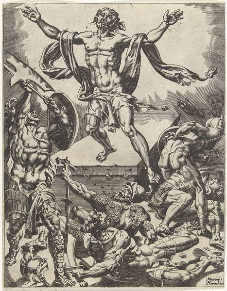 Curator: The raw emotion of this piece really strikes me. Look at "Crucifixion of Christ" a print created sometime between 1590 and 1632 by Pieter de Jode I. The composition, the suffering depicted… it's all so intense. Editor: Yes, it is viscerally affecting. Considering its historical context, the use of engraving enhances the drama, don’t you think? Its visual language relies on established notions of pathos from both artistic and religious history. Curator: Absolutely, the Baroque style is undeniable here – the dramatic lighting, the dynamic composition – everything serves to amplify the emotional impact on the viewer. But beyond the immediate emotion, I'm drawn to the iconography, the arrangement, how these symbols play out across cultures over time. Editor: True, we see familiar figures, rendered through the lens of Baroque aesthetics and amplified by counter-reformation sensibilities: but how would a viewer at the time, perhaps involved in the socio-political conflicts of the age, have perceived this work? How did that influence de Jode’s practice? Curator: A piece like this works as a nexus of ideas. It’s more than a visual representation. For believers then, but even to the secular eye today, that central figure symbolizes sacrifice, suffering, and redemption—universal themes expressed through very specific cultural symbols. Editor: Exactly, and the image is not just for religious devotion, or solely an exploration of de Jode's creativity and skill. These kinds of widely disseminated prints actively constructed religious and political identities, bolstering specific positions. It's not neutral, even in its assumed piety. Curator: So it holds within it multiple layers of meaning – theological, yes, but also deeply embedded within the social and political context of its creation and reception. Editor: Indeed. Looking at the image now, I am more keenly aware of the silent but powerful roles images play in structuring our understandings of the world. Curator: And I’m left wondering about the lasting power of archetypes, how certain stories and symbols continue to resonate.