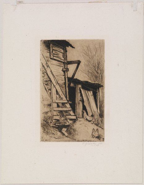 Curator: Sidney L. Smith's print, "Barrett's Grist Mill," presents an interior view of a mill, rendered with remarkable detail. Editor: There’s a haunting quality to it, isn’t there? A sense of forgotten labor, decay, and the relentless march of time. Curator: The image evokes the symbolic weight of the mill itself: a space of transformation and provision, its infrastructure now laden with the dust of disuse. It reminds us of how human industry shapes and reshapes the natural world. Editor: I agree. Mills also represent community reliance. It's interesting to think about how these spaces were often central to local economies and social structures, and what their abandonment says about shifts in power and resources. Curator: Indeed. The artist uses sharp contrasts to emphasize the texture of aged wood, and how the light filters down through the dusty, cobwebbed rafters. Editor: This print serves as a reminder of the transient nature of human endeavors, inviting reflections on history, progress, and sustainability. Curator: Absolutely. It’s a poignant visual reminder of our relationship with labor and the landscapes we both build and abandon.