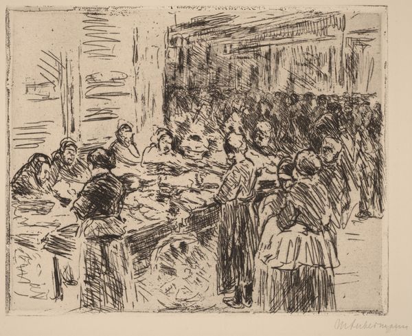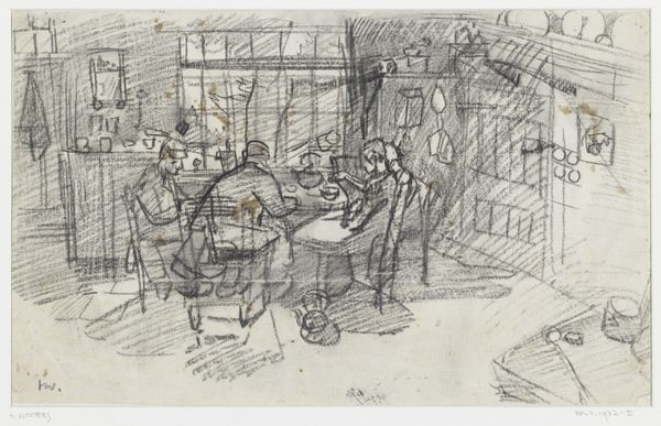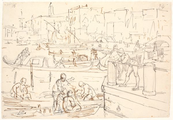 Charles François Daubigny sketched Lunch at Asnières Before Departing with pen and brown ink on paper. At first glance, the loose hatching and scribbled lines, particularly in the foliage, might suggest the work of an amateur, yet it's precisely this informality that offers insight into Daubigny’s structural approach. The composition is divided between the architectural stability of the shaded building on the left and the looser natural forms to the right. Notice how Daubigny has used the linear hatching to unite these zones, drawing the eye across the scene while creating depth, so that the landscape seems continuous with the interior gathering. The use of line, from the vertical strokes of the door frame to the rapid, swirling foliage, creates both a sense of immediacy and of the scene’s transient nature. The sketch destabilizes conventional landscape and genre painting, suggesting an interest in the materiality of line itself. This approach is not just descriptive; it's an exploration of how marks on paper can define space, form, and perhaps, even the fleeting experience of a moment shared before departure.
