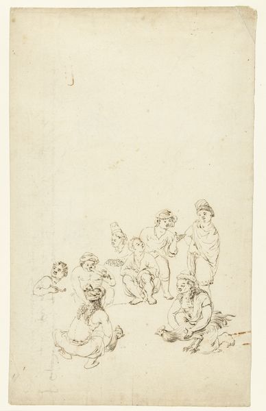 Stefano della Bella made "Groups of Men Talking" with pen and brown ink on paper. It's a common enough medium, yet look closely, and you'll see how the material itself influences the image. The ink, fluid and responsive, allows for rapid, gestural lines. Notice how the artist uses quick strokes to capture the figures, giving the scene a lively, spontaneous feel. There’s a remarkable economy of means here, a real skill at suggesting form with minimal effort. Della Bella was, in essence, an early modern sketch artist. The small scale also matters; this isn't a grand history painting, meant to impress with sheer size and labor. Instead, it’s an intimate study, a moment captured on paper. This speaks to a shift in artistic values, where observation and immediacy become prized, alongside the craft to bring it into being. It challenges the traditional hierarchy between preparatory sketch and finished work. In the end, it’s a testament to the power of simple materials, handled with skill, to convey the human experience.