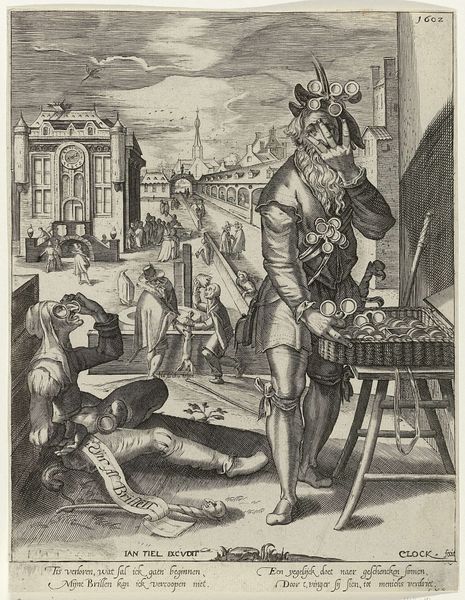 Curator: Immediately, I’m struck by the density of detail in this engraving, the sense of narrative crammed into every corner of the image. Editor: Indeed. This is "Hoorndrager" dating from after 1586, and attributed to Nicolaes Jansz. Clock. As a genre painting, its setting is very down to earth and ordinary but carries complex implications. We see a man looking distraught within a crowded interior space. The texture of this print is wonderful, the way Clock renders surfaces through line work really emphasizes the weight of material things around this figure. Curator: Right, look at the owl, dog, and embrace—each a small drama adding to the overall sense of domestic chaos and, let’s be honest, social commentary. The engraving medium allows for the widespread dissemination of such images, fostering critical dialogue among contemporary viewers about labor. Editor: Absolutely. The scene suggests infidelity, or perhaps just a loss of control. What fascinates me is how the imagery draws on the symbolism of cuckoldry prevalent at the time, reinforcing norms and power structures. I wonder about the social function of such a piece: was it intended as cautionary tale, or to ridicule domestic failures? Curator: I think the dog rummaging in the pot tells it all: material loss or access and animal instinct run riot while the man scratches his head cluelessly. But what are all those metal pots used for? What is being made in this domestic scene? That to me is an essential materialist angle into reading it. Editor: Good point. Perhaps he isn't clueless but simply a passive participant within broader social expectations of men and labour of the era, which would involve craft making of pots and metallic works. He may very well represent not failure, but a particular relationship to materiality which the piece encourages us to examine. The choice of an engraving ensured this critique could be seen and debated by the widest audience. Curator: Food for thought – and for further research. I keep coming back to the textures achieved through engraving - quite remarkable. Editor: And for me, I will remember how “Hoorndrager” embodies a crossroads between the domestic, social anxieties, and the power of accessible imagery during that period.