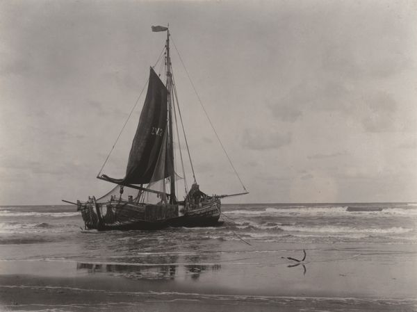 Editor: This gelatin silver print, "The Incoming Boat" by Alfred Stieglitz, made around 1894 to 1897, is quite striking in its monochrome palette. The rough sea and the labouring boat project such an atmospheric mood, and the way it foregrounds both the water and reflection… What do you make of it? Curator: As a materialist, my attention is drawn to the labour embedded in its production, both that of the fishermen and Stieglitz himself. What kind of labour, physically and socially, was involved in making such a print at the time? Consider the processes of acquiring materials, darkroom practice, and distribution networks to art exhibitions… What was the status of photography as a material practice then, relative to other arts and trades? Editor: So you’re saying it’s more than just an image, but an index of all that work? Curator: Precisely. The print becomes a tangible record of the photographer's intervention. His use of gelatin silver— a relatively new process back then – represents a choice with socioeconomic implications. Mass production of photographic materials allowed greater access but simultaneously industrialized the art form. How might this have affected photography's claim to artistic status? Editor: I see your point. The ‘hand of the artist’ argument is less clear-cut here than it might be in, say, painting. Curator: Exactly. The very ‘truthfulness’ once associated with photography should also be reconsidered: Stieglitz uses his materials and compositional skills, honed by practice and training, to suggest particular meanings and manipulate a supposed objectivity. Editor: I never thought about the materiality of photography this way. Thank you, this definitely gives me a new angle to appreciate Stieglitz's effort. Curator: Indeed. By analyzing the production process, the class connotations in consumption of photography as an artwork, and its means of distribution, we enrich the narrative beyond simply seeing a pretty picture.