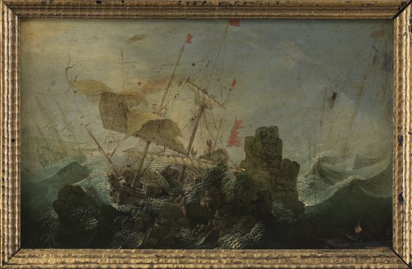 Editor: So, this is the "Slag op Doggersbank," or "Battle of Dogger Bank," painted in 1792. It's oil paint, and the scene is quite striking with the gold ships against a dark backdrop. What strikes me most is the kind of simplified representation – what are your thoughts on this piece? Curator: Looking at this from a materialist perspective, I'm fascinated by how the very process of its creation mirrors the socio-economic conditions of the time. Oil paint itself was a commodity, part of the expanding trade networks. Do you notice how the application is so precise, almost like decorative craft? Editor: Yes, I see what you mean! The gold leaf details definitely give it a more decorative, rather than strictly "fine art," feel. How does that relate to its context? Curator: Well, this blending of craft and art complicates our traditional understanding. Was it meant for a wealthy patron to commemorate Dutch naval power and trade success, a celebration of labor and the spoils of war? Think of the labor involved in shipbuilding, the production of the paint itself – this painting is the end result of extensive material processes. Editor: So, it's not just *depicting* the battle, but also a product *of* the economic systems surrounding naval power? Curator: Precisely! Consider the accessibility of the artwork. Was it made for the elite, or did printed versions circulate to shape public opinion? The medium itself participates in shaping narratives of power and consumption. Editor: That's fascinating. I've never really thought about art in this way, seeing the connection to all the labor and resources that go into creating even a single painting. Curator: It really encourages us to look beyond the surface, right? The story is in the materials and the making as much as the image itself.