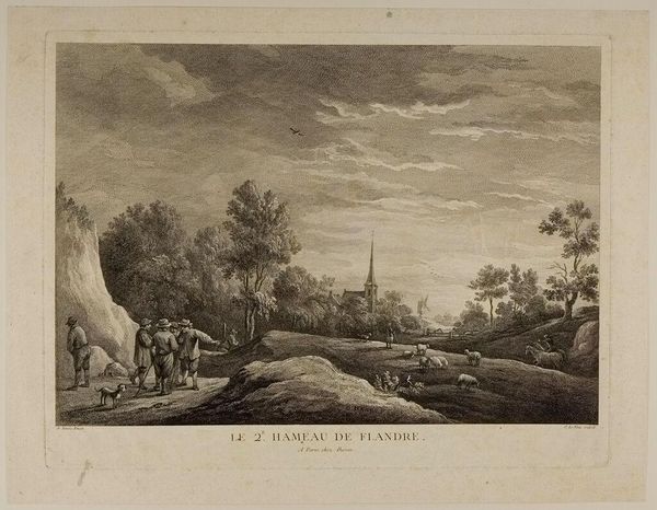 Editor: We're looking at "The Delights of Winter," an engraving from 1759 by Pierre Charles Canot. It depicts people enjoying winter activities on a frozen landscape. There's something really charming and nostalgic about it; it's like stepping back into a simpler time. What do you see in this piece? Curator: Simpler times, indeed! It makes me think of a snow globe, doesn’t it? Trapped inside is this perfect little world. The artist seems to be capturing that fleeting moment of joy amidst the harshness of winter. Notice how the composition is almost split, the cozy houses on one side and the aged windmill on the other, but unified by the icy expanse. How does that contrast strike you? Editor: That's interesting. I guess it highlights the contrast between the man-made and natural worlds, but both are essential to the scene. The darkness in the foreground also seems to set off the activity in the center and background of the image. Is it simply a picturesque scene, or something more? Curator: Well, "genre painting" like this, although seemingly straightforward, often subtly communicated societal values and everyday life to the elite. Here we see people of different classes interacting on the ice. Maybe it’s a commentary on shared human experience transcending social strata or simply a fashionable take on everyday scenes and leisure in winter. Editor: So it's not just about the pretty picture. Curator: Never is, my friend! Art whispers secrets of its time, and we are the detectives trying to listen. Editor: That’s a wonderful way to put it! Now I see how much is contained within this small print. Curator: Precisely. Every stroke, every shadow is a tiny clue. It has made me want to brave the winter and find a snowy escape myself, hot cocoa in hand, of course!