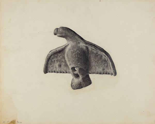 Editor: So, this is Frank Gray's "Snow Breaker" from around 1940. It looks like a drawing, probably in pencil and maybe watercolor. I find the geometric quality really interesting and striking, though the title doesn't immediately make sense to me. What strikes you about this piece? Curator: Well, immediately the eagle evokes a certain nationalistic symbolism, doesn't it? But this isn't a soaring, majestic eagle; it's grounded, almost brooding. Think about the social climate around 1940. What national narratives were prevalent, and perhaps, being questioned? This artwork becomes particularly potent when viewed in relation to that period's discussions about patriotism and national identity during times of turmoil. Editor: So, the image plays with our expectations? You expect a symbol of freedom and strength, but this rendering feels much more constrained, grounded as you said. The title itself, "Snow Breaker," hints at something difficult, perhaps even a burden. Curator: Exactly. The artwork participates in a dialogue about what American identity truly represents. Gray seems to be aware of the socio-political implications of such imagery. He transforms this charged symbol, provoking a more introspective interpretation of its meaning within that specific period. Who benefited from displays of patriotism and at what cost? What happens to the collective identity after periods of great conflict and crisis? Editor: That gives me a lot to consider about how even seemingly straightforward images can carry such a complex cultural load. I guess I always think of the bald eagle being very heroic. I’ll have to examine them in new light going forward. Curator: Indeed. It’s about understanding the visual language an artist uses, but more critically, being attentive to how museums, institutions, and public rhetoric at the time amplify certain voices or neutralize others through displays of art. "Snow Breaker" pushes us to think critically about such issues.