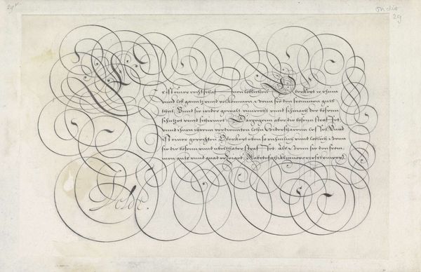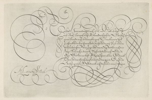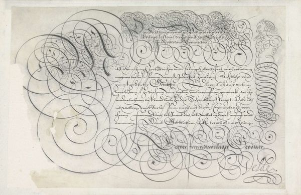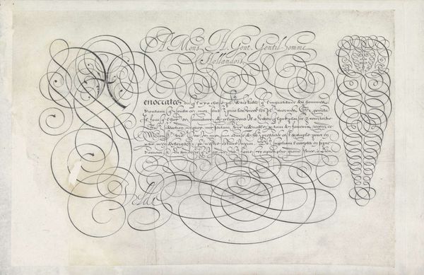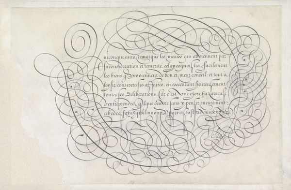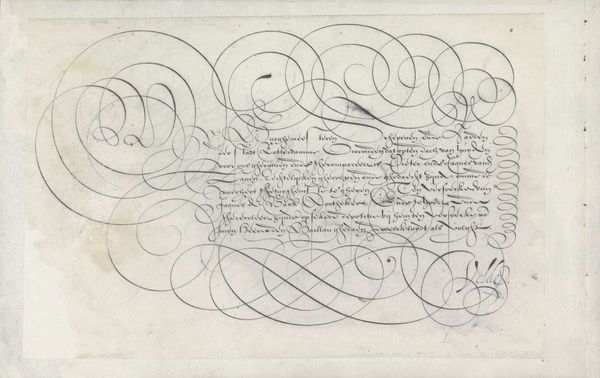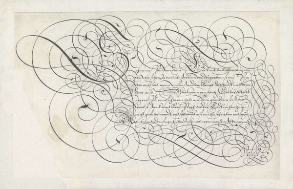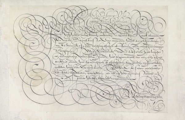 This is a writing sample by Jan van de Velde I, made with pen and ink. It is a dance of swirling lines and elegant curves. It presents an aesthetic of abundance that is as much visual as it is textual. Note the interplay between the calligraphic forms and the textual content, where the script seems to float almost independently of its semantic function. The dense arrangement of looping lines creates a visual field that challenges conventional notions of legibility and textual hierarchy. This effect is accentuated by the spiraling flourish at the top left. It functions almost as a vortex, drawing the eye into a complex interplay of form and void. In a broader sense, the work reflects the early modern period's fascination with virtuosity and display. The elaborate script served less as a transparent medium for communication, and more as a demonstration of skill, artistry and status. Ultimately, this piece invites us to consider how the formal qualities of writing can transcend mere communication and operate as a sophisticated form of visual expression.