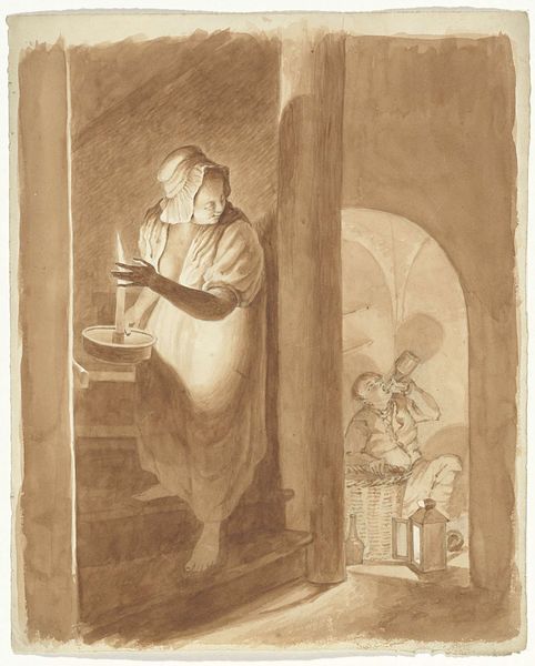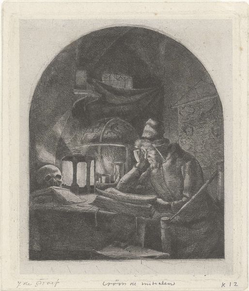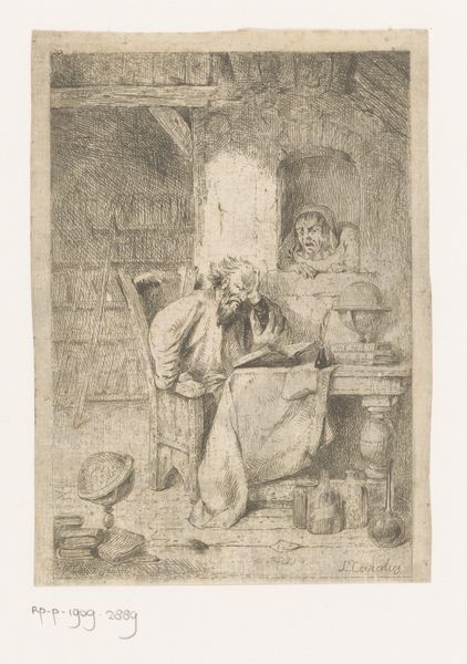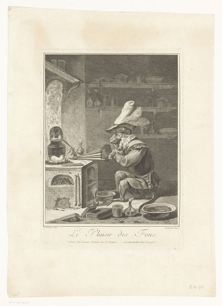 Editor: So, this etching, attributed to Pierre François Basan and dating from between 1739 and 1797, is called "Spotprent van een apotheker als aap," or "Caricature of an Apothecary as an Ape." It depicts exactly that – an ape dressed as an apothecary in his shop. The detail is quite striking. What stands out to you in terms of its historical context or even the artist's technical process? Curator: Considering it’s an etching, focus on the labor embedded in its production. Each line meticulously carved, each plate carefully inked. This image critiques not just the apothecary, but the systems supporting him. Observe the overflowing shelves, suggesting an abundance, even waste. Is it critiquing access to materials, or is the etching process trying to give the viewr insights on overconsumption by upper-middle class men? Editor: That's interesting, focusing on the abundance aspect. I hadn’t considered the comment on overconsumption. I initially interpreted the caricature simply as a commentary on the quackery often associated with apothecaries. Curator: Consider what "quackery" signifies in this context. It’s not merely deception but speaks to the accessibility, production, and social relationships surrounding medicine. An ape, the caricature's center, becomes a conduit for discussing issues around class and commodity during this period. Could the piece’s function be one of challenging existing hierarchies or simply reinforcing them? Editor: So you're saying it’s not just about mocking a profession but understanding the societal systems at play that allow for, or even encourage, such practices? The material abundance visible through the artist's mark-making actually speaks to broader economic and social anxieties? Curator: Precisely! And this makes the "Spotprent" less about the individual apothecary and more about the conditions that create and sustain his practice. What does this suggest to you about its creation? Editor: That really changes my perspective. I’m starting to think of the image less as a standalone artwork and more as a product deeply embedded in its specific historical and economic moment. I’ll definitely look at art differently going forward. Curator: And by focusing on materials and the context in which art is produced, it offers an enriched, dynamic viewing.