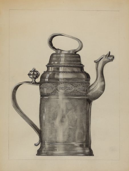 This drawing of a Pa. German Coffee Pot was made by Herman Bader, we don't know when exactly, but perhaps it doesn't matter. I love that this is just a humble drawing, almost like a technical study, but it sings with light. Look at how Bader has rendered the shine of the pot. It's not hyperreal, but in the gentle gradations of graphite, we sense the material and how light reflects on it. See the carefully drawn floral decoration on the pot's belly? It’s like folk art meets metalwork. Each mark feels deliberate, giving the object a quiet, dignified presence. The undulating lines around the base of the pot also add a sense of rhythm, like a visual echo of the liquid it might hold. It makes me think of other artists who blurred the line between representation and abstraction, like Charles Sheeler with his industrial landscapes, finding beauty in everyday objects. In its simplicity, this drawing invites us to slow down and appreciate the artistry in the mundane.