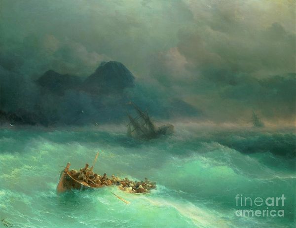 Ivan Konstantinovich Aivazovsky's "The Shipwreck on Black Sea" plunges us into a dramatic maritime scene, dominated by turbulent waves and foreboding skies. Notice how the diagonal composition emphasizes movement and instability, drawing our eyes from the dark, looming cliffs to the fragile boats tossed about in the sea. Aivazovsky masterfully uses contrasting light and shadow to create a sense of drama. The white-crested waves catch the light, creating a stark contrast with the dark clouds, intensifying the feeling of chaos. The brushwork is loose and expressive, particularly in the depiction of the water, which seems almost alive. The contrast between the sublime power of nature and the vulnerability of the human figures raises fundamental questions about existence, resonating with existentialist thought. The dramatic use of light, the dynamic composition, and the expressive brushwork combine to evoke a powerful emotional response, inviting us to contemplate the precariousness of human life in the face of nature's overwhelming force.