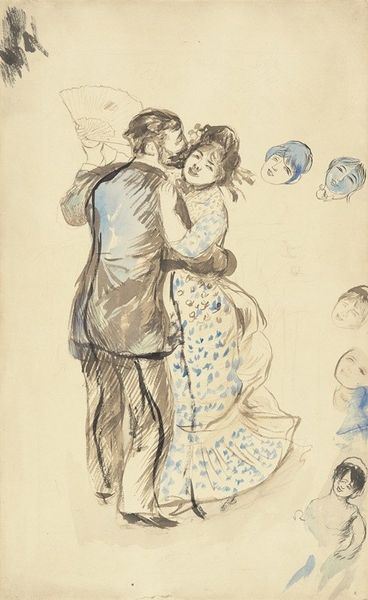 Editor: We're looking at Renoir’s *Country Dance*, painted in 1883. There’s a real feeling of light and movement—it's like we've just stumbled upon this intimate moment. What's your initial impression? Curator: Oh, to be swept off one's feet, eh? I see a vibrant snapshot of Parisian leisure, a dance, a flirtation maybe? Renoir was a master of capturing those fleeting moments of joy. But it's more than just a pretty picture; it's a study in contrasts – the formality of the gentleman’s dark suit against the airy lightness of the woman’s floral dress. See how the composition guides your eye in a delicious spiral? Are we invited in, or observing something truly private, do you think? Editor: It feels very intimate, almost like we're intruding on their moment. That contrast you mentioned is striking—it highlights her youthful energy. I hadn’t noticed the spiral before, that’s a cool observation. Curator: Indeed! The colors are scrumptious too—the reds and blues grounded by earthier tones. This work is so delicious because, much like life itself, it blends structured elements with absolute fleeting, transient joy. Does the discarded hat tell us they only just started dancing? Or have been going at it for ages? That open-endedness really appeals to me. Editor: I love how Renoir leaves room for interpretation. It's not just a dance; it's a story waiting to be written. Curator: Exactly! It makes one want to leap into the painting and join them, doesn't it? Makes me want to kick off MY shoes! So what's the real takeaway here for you? Editor: That even within constraints of formal portraiture, Renoir captured life's spontaneity with such vibrancy. A celebration of youthful joy! Curator: Nailed it!