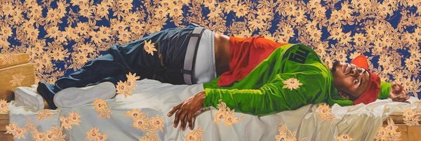 Curator: Kehinde Wiley’s “Femme Piquee Par Un Serpent II,” crafted in 2010, presents a powerful figure against a striking background. It is executed in oil. My initial reading? Decadent, unsettling. A strangely beautiful collision of ease and vulnerability. Editor: It’s interesting how Wiley positions this figure, recumbent yet defiant, amidst that vibrant wallpaper. Considering its title, a possible reference to classical art is evoked. Wiley is known for taking figures directly from the streets of urban communities, casting everyday people of color into the aesthetic of the Old Masters, thus directly confronting art history's exclusivity. Curator: Absolutely. The art historical allusion is unavoidable and that contrast, of course, is intentional. The wallpaper becomes more than mere backdrop; it’s a suffocating tapestry that both celebrates and confines him. Look closely at the play of the lines, the geometric composition within the swirling, organic motifs. Editor: In viewing that visual vocabulary in its social and political setting, this opulent pose also echoes historical representations of power and leisure which traditionally excluded Black figures. The inclusion and assertion is quite profound in a space that had always been prohibited. It forces viewers to reassess what power and elegance signifies in modern context. Curator: The interplay of texture and color reinforces that. His streetwear juxtaposed with the hyper-real floral arrangement creates tension. I'm fascinated by the surface quality itself - the oil paint manipulated to mimic both smooth skin and coarse fabric, while still rendering them "larger than life." There are also hints of something, possibly a floral design on the bedding itself; note how it doesn't quite match but amplifies the impact. Editor: Precisely. Wiley's strategic fusion of Western art traditions with modern black culture is a sharp statement on race and identity. This work reflects conversations within Afrofuturism where these imagined futures demand reclamation of present-day social dynamics in order to project empowerment into the unknown and what we believe is possible. Curator: Seeing those varied textures, then thinking of afrofuturism, is fascinating because that reading shows how this piece opens onto a broader space of self determination where Black aesthetics are central and always valued. Editor: I agree. Wiley makes an important move that demands historical reckoning, not to leave audiences paralyzed but engaged with current narratives.