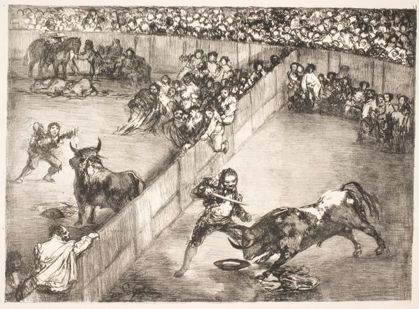 Francisco Goya created this aquatint etching of a bullfight in Bordeaux. Here, we witness a dramatic clash: the picador, mounted on horseback, is caught in the bull's raw power. The bull, an ancient symbol of virility and primal force, throws the horse while other bullfighters attempt to help the picador. The motif of the bullfight stretches back to ancient Minoan Crete. There, bull-leaping was a sacred ritual, a dance with death that honored the animal's strength. This symbolism evolved through the Roman arena, where bulls battled gladiators. In Goya’s Spain, the bullfight transformed again. The bull is no longer merely an animal but embodies a contest between civilization and nature. Consider the emotional impact of this scene. Goya captures the chaotic energy and intense drama of the bullfight, a spectacle of life and death. It’s a primal scene, engaging our collective memory, resonating with the knowledge of mortality. This image is a vivid illustration of how symbols evolve. The bull, once a sacred animal, became a spectacle, a dance of death, continually resurfacing throughout history, transformed but still echoing its ancient roots.