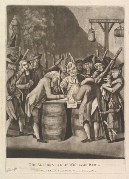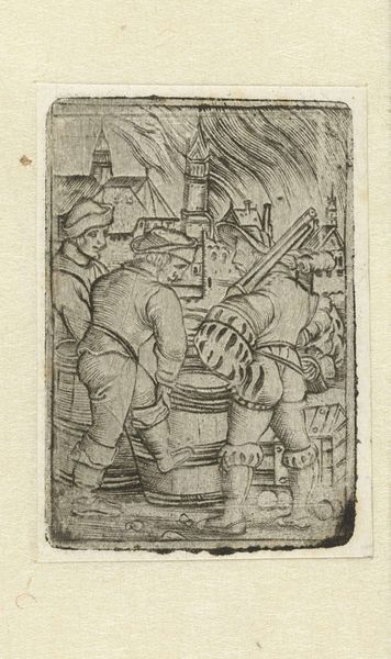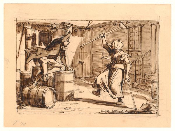 Editor: So, this is "Bierdragers," a pen and ink drawing by Jacob Ernst Marcus, created sometime between 1784 and 1826. It's currently held at the Rijksmuseum. It has an informal, sketch-like quality that I find really appealing. What jumps out at you? Curator: The artist's choice of medium, pen and ink, immediately establishes a graphic and linear quality. Consider the compositional strategy; the arrangement of figures and barrels creates a dynamic interplay of forms. Note how the linear perspective, while not perfectly executed, contributes to the spatial depth. Editor: Yes, I see what you mean. It’s not photo-realistic, but it conveys depth effectively. Do you think the roughness of the drawing detracts from its overall impact? Curator: On the contrary. The roughness, the visible traces of the artist's hand, emphasize the materiality of the work. The variations in line weight, the areas of dense hatching, all contribute to a textural richness that wouldn't be present in a more polished work. It highlights the process of creation, foregrounding the artist's active role in constructing the image. We might consider it an early, informal exercise in form, color, or structure rather than a finished idea. Editor: So, you're focusing more on the 'how' than the 'what' of the image, on the relationship between the artist, their materials, and the process of creation, instead of some narrative. Curator: Precisely. Editor: That’s fascinating. I hadn’t considered analyzing it that way before. I was initially drawn to the implied narrative, but seeing the value in just focusing on the artistic form changes my understanding. Curator: Indeed. A keen observation shifts focus.