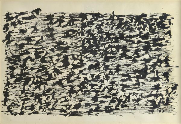 Editor: This untitled print by Henri Michaux features dynamic black marks on a white background. It feels chaotic, almost like a swarm. What do you see in this piece? Curator: The density and frantic energy certainly evoke a sense of unease. Michaux, working post-war, often explored themes of trauma and the fragmentation of the self. Does this image reflect a societal anxiety, a loss of collective identity perhaps? Editor: I hadn't considered that context. So, the chaos could be a reflection of larger social disruptions? Curator: Precisely. Consider how the lack of a defined subject allows for multiple interpretations, reflecting the instability of the time. What do you think that says about the role of the artist? Editor: It makes the artist less of an authority and more of a mirror, reflecting back what society is feeling. That's powerful. Curator: Indeed. It challenges us to confront uncomfortable truths and question established norms. It is a glimpse into the artist's psyche, and perhaps our own.